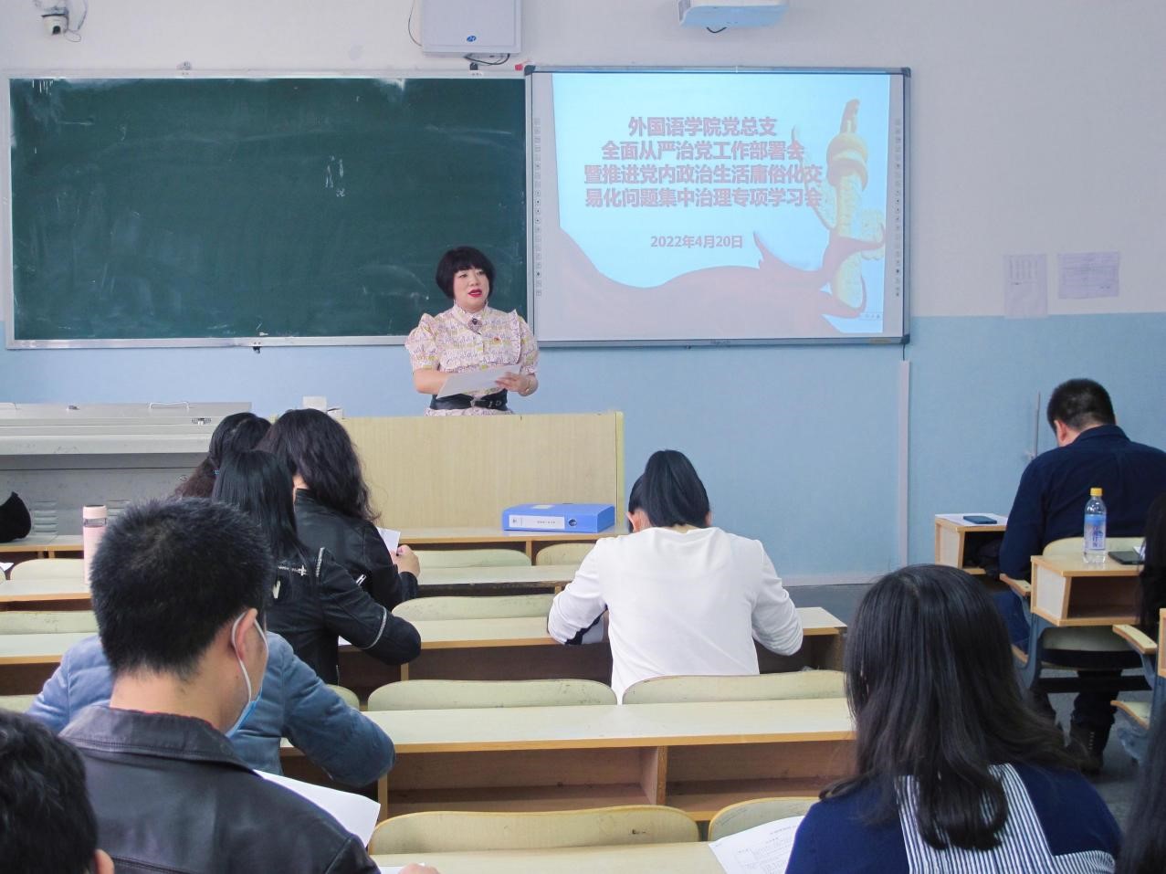 4月20日下午4:00时,外国语公司党总支在师专楼106召开2022年全面从严治党工作部署会暨推进党内政治生活庸俗化交易化问题集中治理专项学习会。会议由党总支书记金鑫鑫主持,365best体育官网登录总支全体委员、各支部书记及全体党员参加会议。