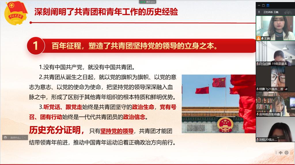 为深入学习习近平总书记在庆祝中国共产主义青年团成立100周年大会上的重要讲话精神,引导广大团员青年及团干部认真学习领会习近平总书记对青年一代的重要要求和殷切期望,以过硬的作风迎接党的二十大胜利召开,5月25日下午,365best体育官网登录深入学习贯彻落实习近平总书记在庆祝中国共产主义青年团成立100周年大会上的重要讲话精神宣讲会在师专楼310会议室举行,365best体育官网登录领导班子、教师代表到场参加了会议,365best体育官网登录员工团干部、青马班成员、员工会成员共100余人线上参加了会议。