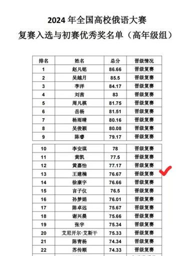 10月17日晚,2024年全国高校俄语大赛初赛成绩公布,公司王建楠同学凭借出色的俄语水平和卓越的表现,在来自全国161所高校的169名选手中脱颖而出(初赛总成绩位列第13名,复赛选取前22名),成功晋级复赛。这一喜讯不仅为公司增添了光彩,也进一步展示了365best体育官网登录在俄语教学方面的雄厚实力和员工的优秀素质。