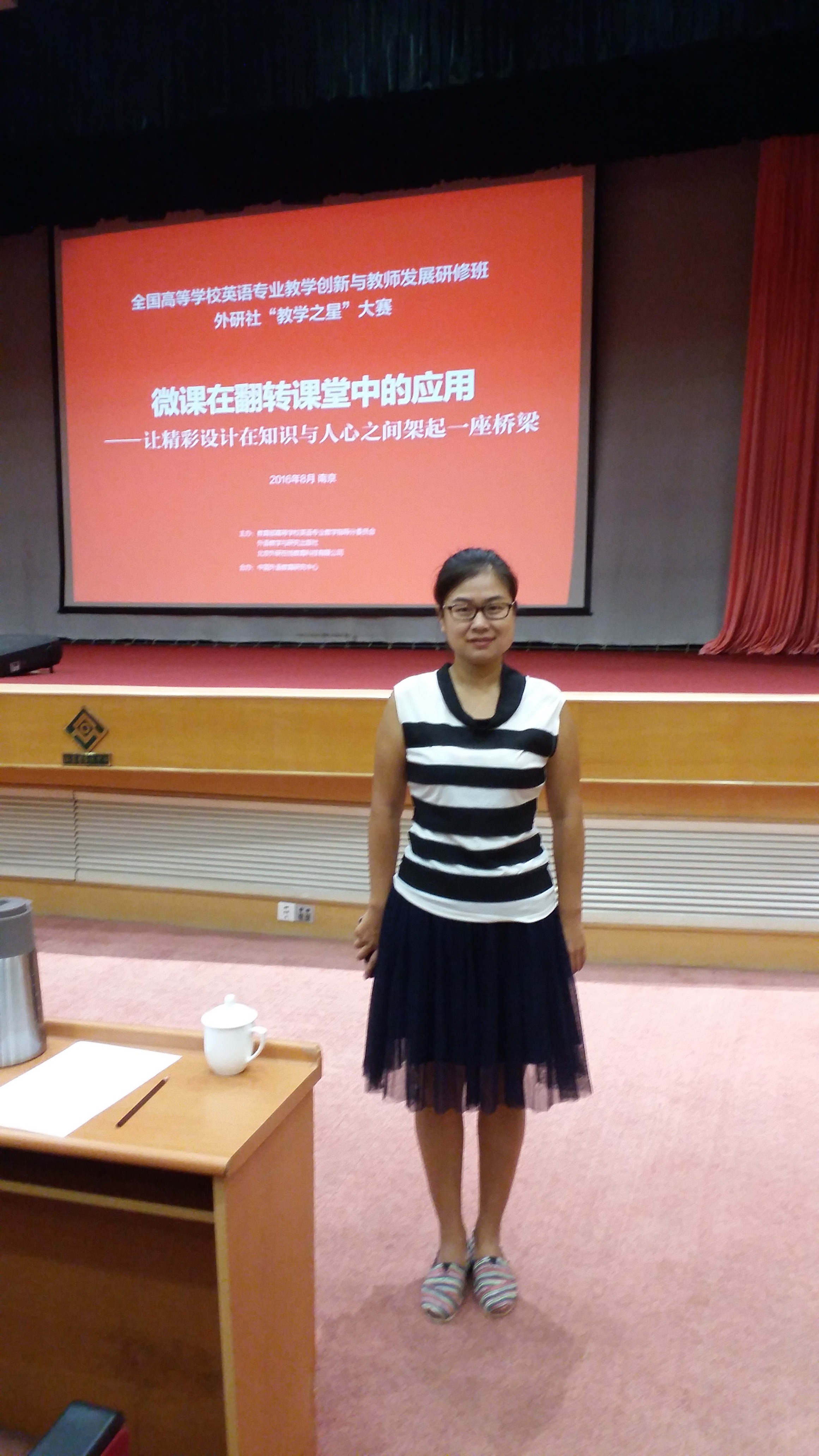 通过聆听专家们的精彩报告,我了解了近期高校英语专业教学改革与发展的最新动态,专家们勇于探索,诲人不倦的精神给我很大的鼓舞。会议的另外一项重要内容是进行主题为“微课在翻转课堂中的应用——让精彩设计在知识与人心之间架起一座桥梁”的“教学之星”大赛。